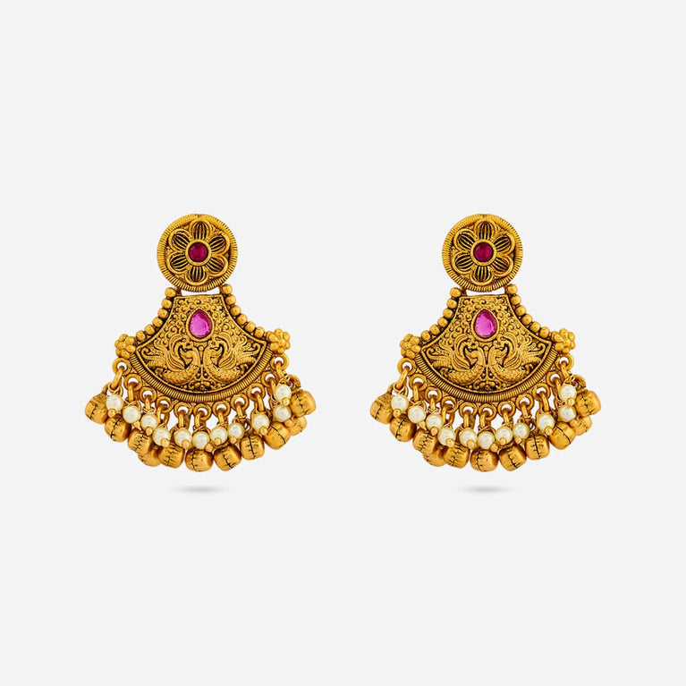 Intricate, festive, and contemporary, this fine ring is all. Adding a refreshing feel of full bloom, the white pearls, embossed gold plated floral design, floral rim, and hint of ruby stone, makes your look more exquisite and unique.