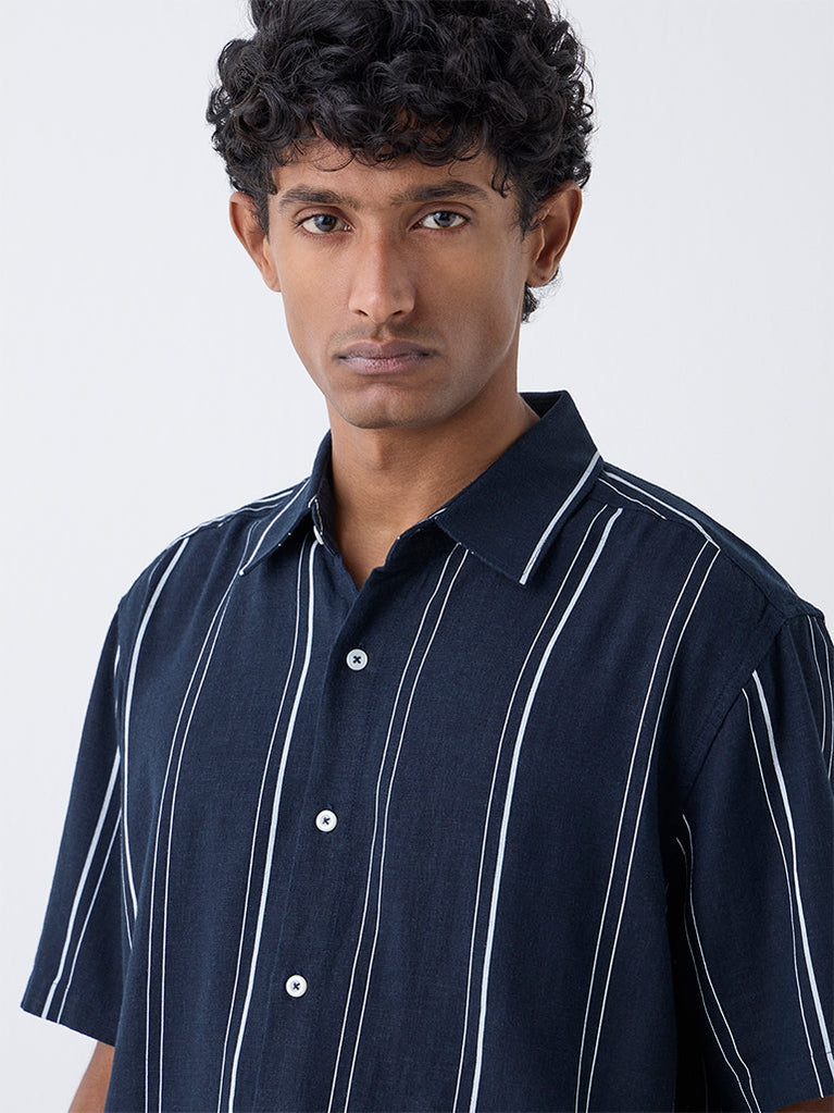 Ascot Navy Striped Relaxed-Fit Linen Shirt