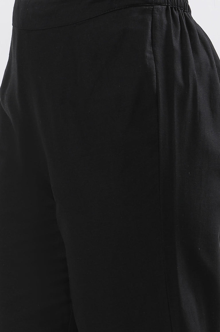 Black solid kurta in round neck a with zari embroidery, paired with flared solid palazzo pants in mid-rise and elasticated waistband.