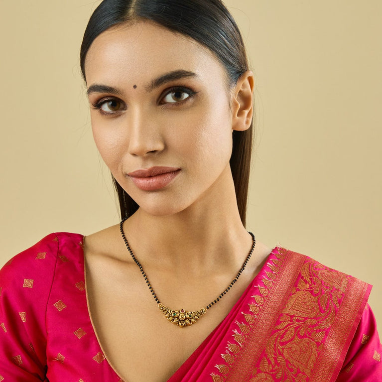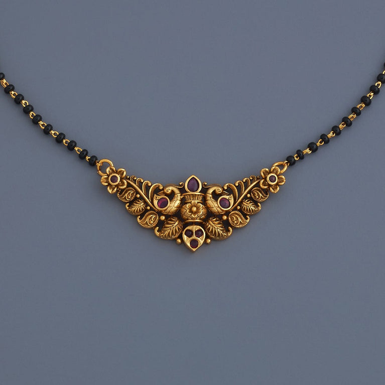 Kushal's Fashion Jewellery Flower Motif Antique MangalsutraIf you want to avoid the hassle of pairing your favourite Mangalsutra with earrings, allow our latest set of antique Mangalsutra and matching earrings to handle it for you. Thanks to its studded ruby stones with gold polish, this mangalsutra set with marvellous earrings will be your perfect partner for all events.