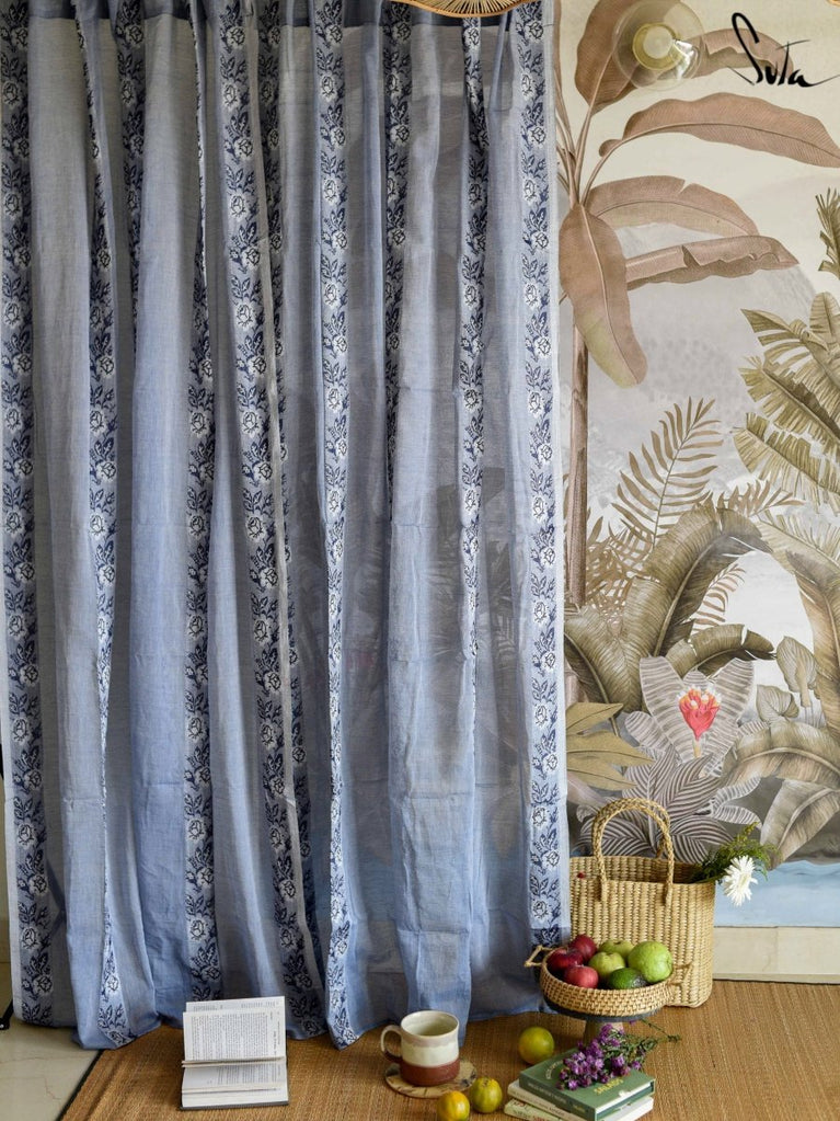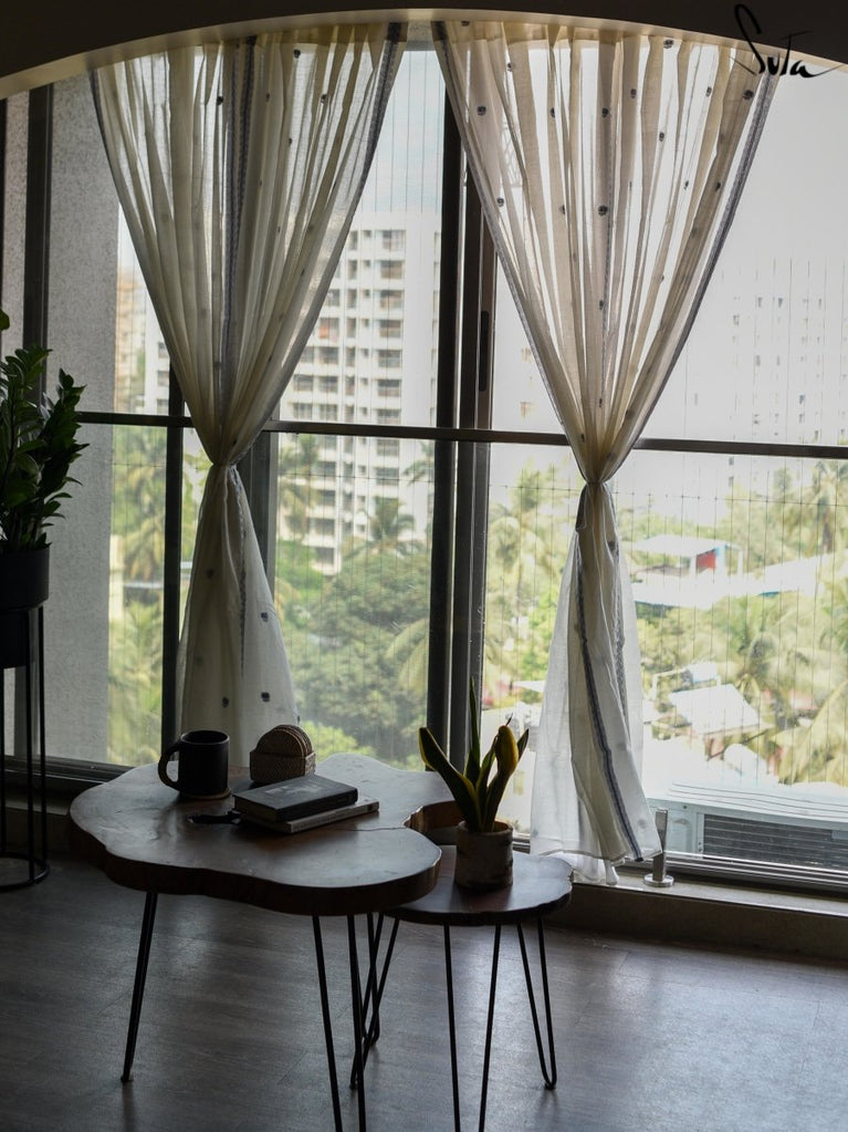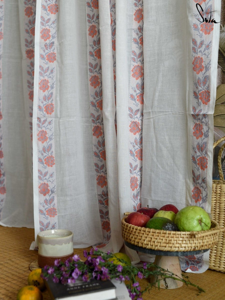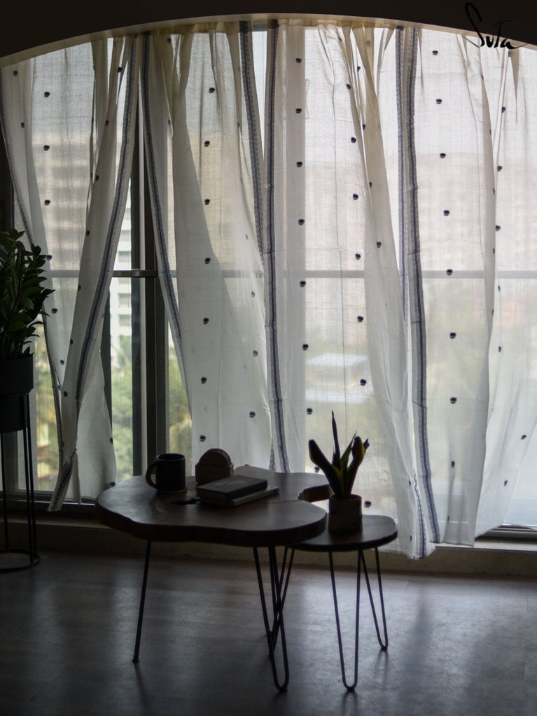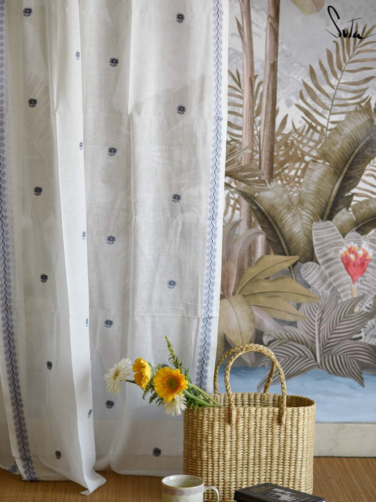 Suta’s signature ‘made in heaven’ mul cotton, is also known as mul mul in West Bengal. The fabric is buttery soft and has a delicate beauty. Its weave is very fine and this lends a very fluid texture to the fabric. These curtains also feature woven floral motifs to add an air of sophistication to the fabric.