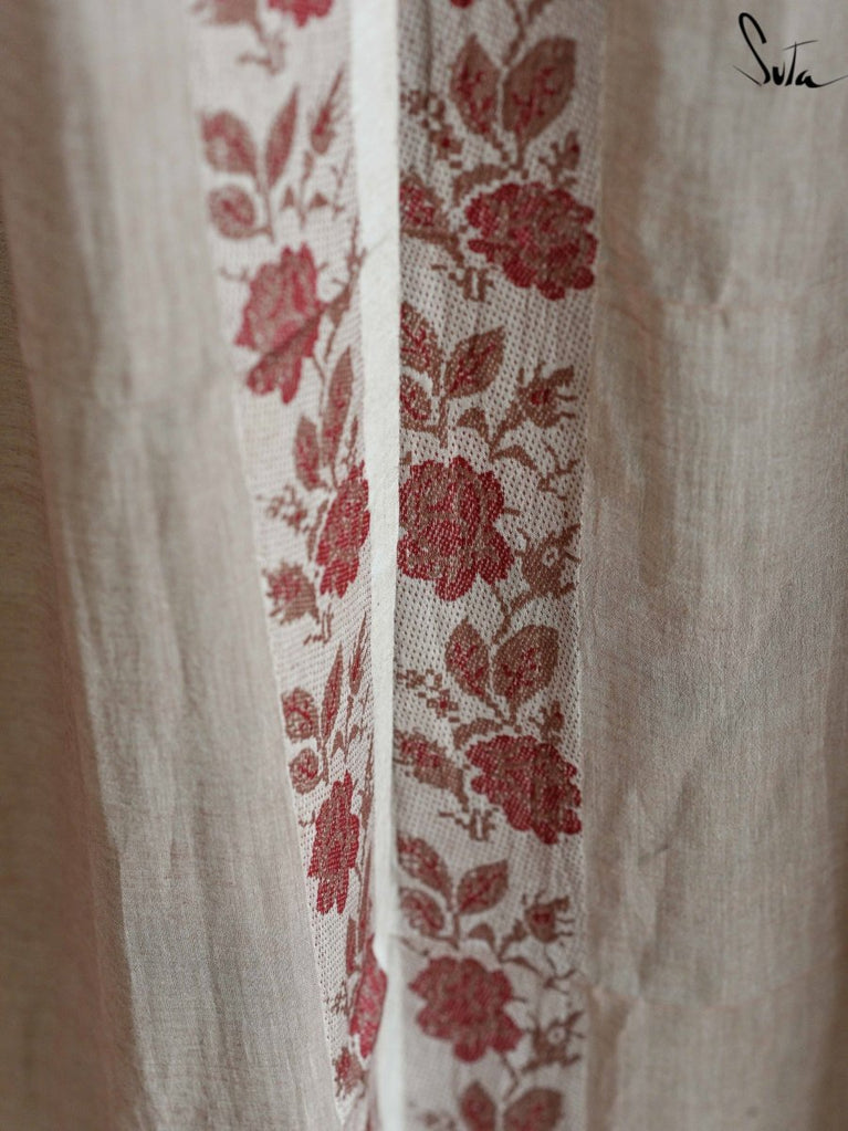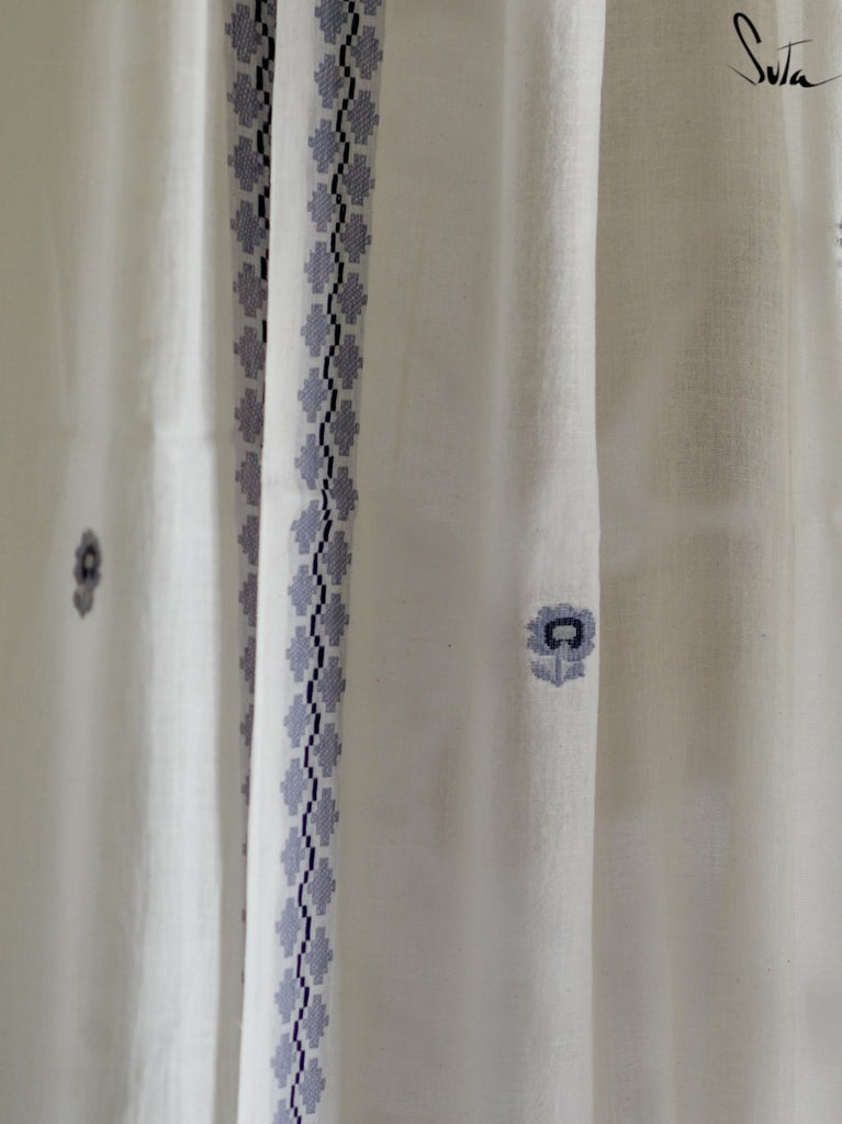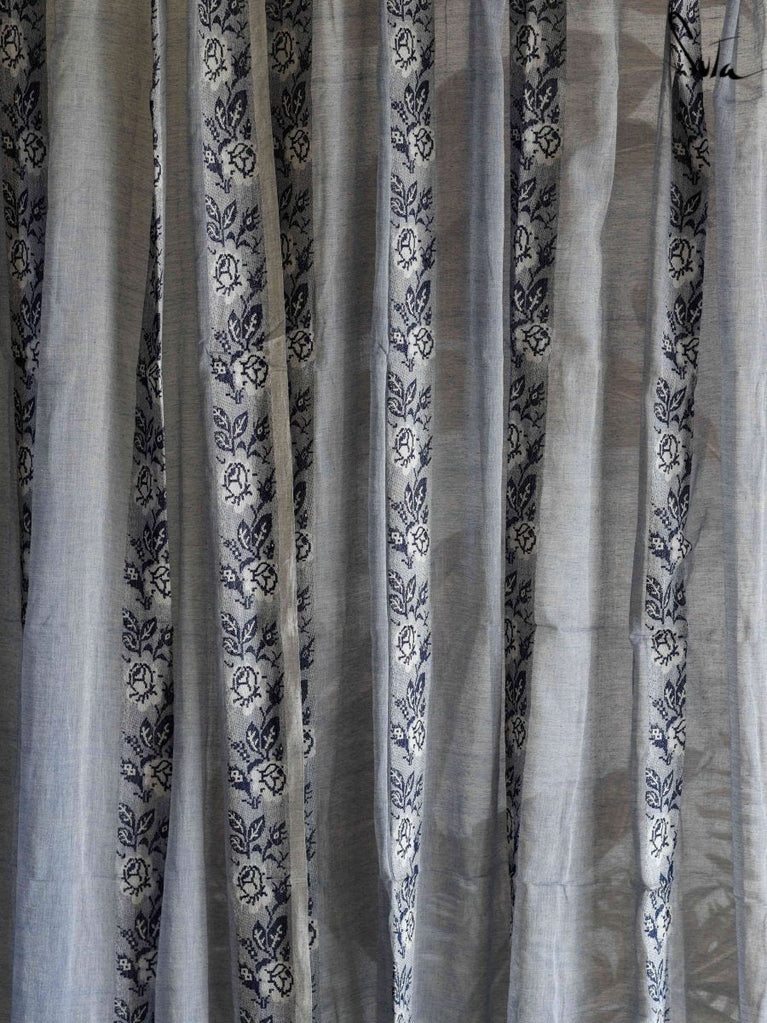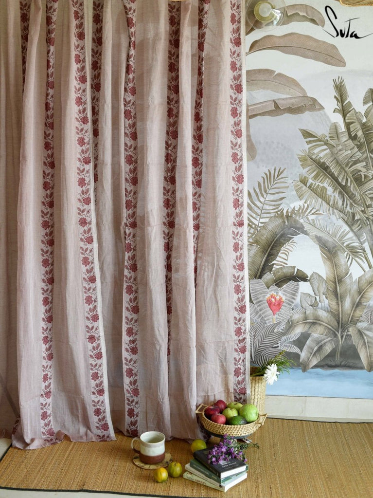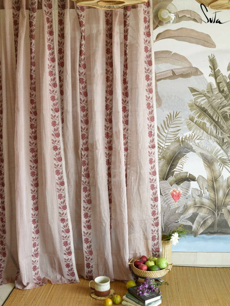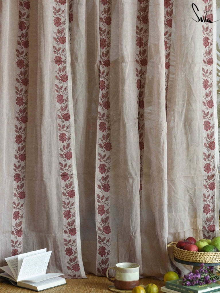 Suta’s signature ‘made in heaven’ mul cotton, is also known as mul mul in West Bengal. The fabric is buttery soft and has a delicate beauty. Its weave is very fine and this lends a very fluid texture to the fabric. These curtains also feature woven floral motifs to add an air of sophistication to the fabric.