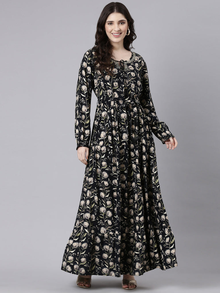 Neeru's Black Flared Casual Floral Dresses
