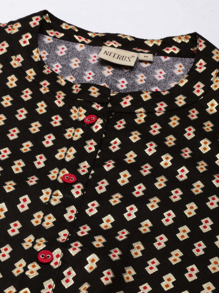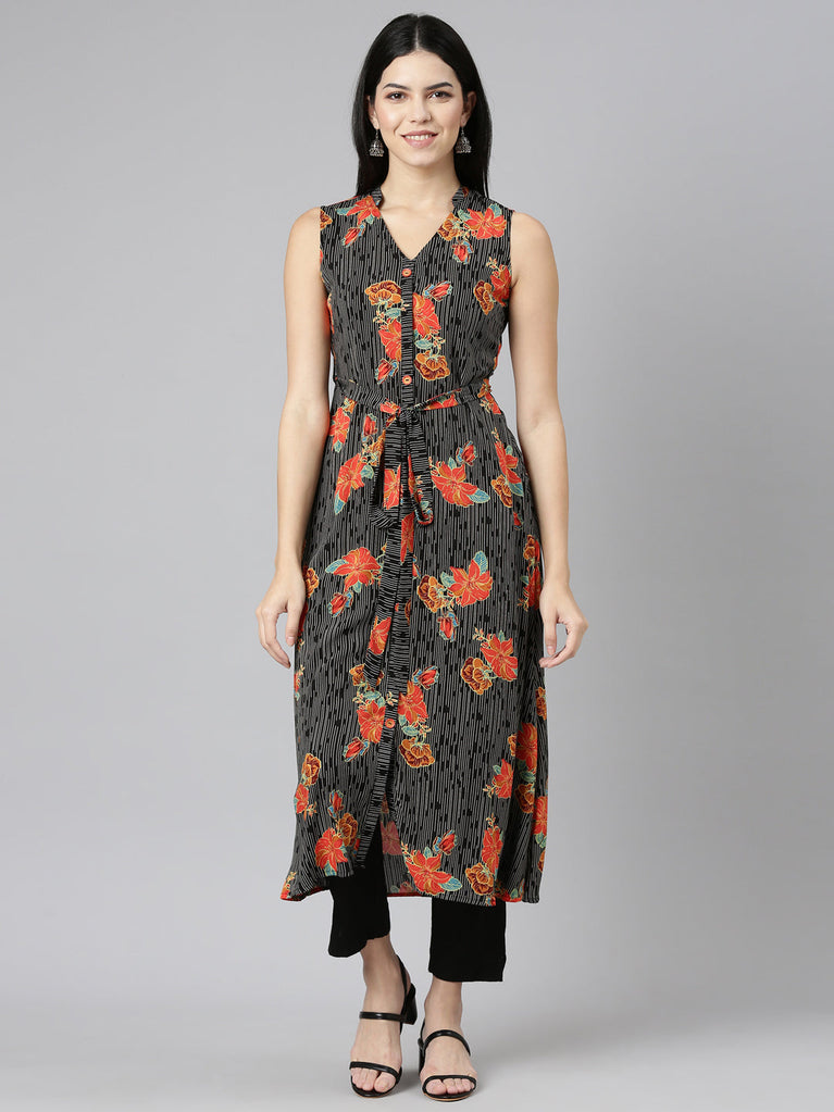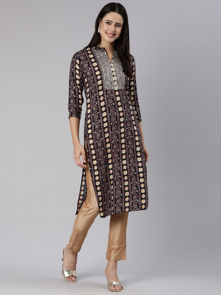Neeru's Black Regular Straight Printed Kurtas
