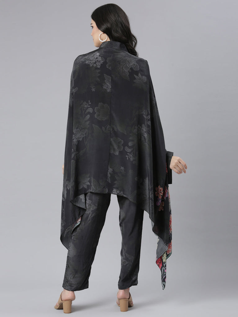 Neeru's Black Regular High-Low Floral Kaftan Kurta Trousers