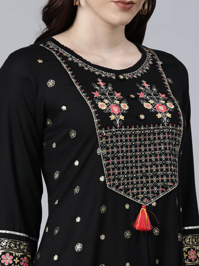 Neeru's Black Regular Straight Embroidered Kurtas