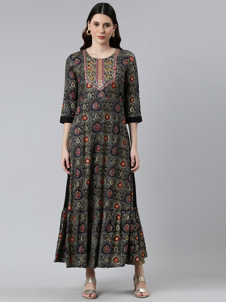 Neeru's Black Regular Straight Paisley Kurtas