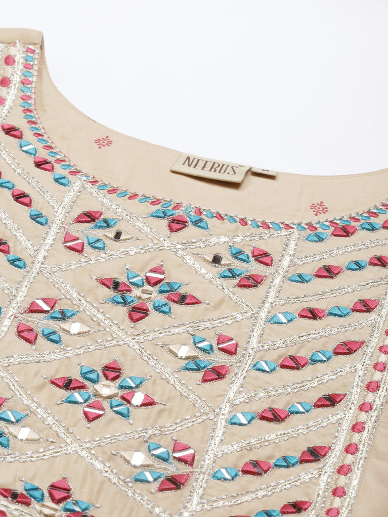 Neeru's Women Beige Ethnic Motifs Printed Mirror Work Anarkali Kurta