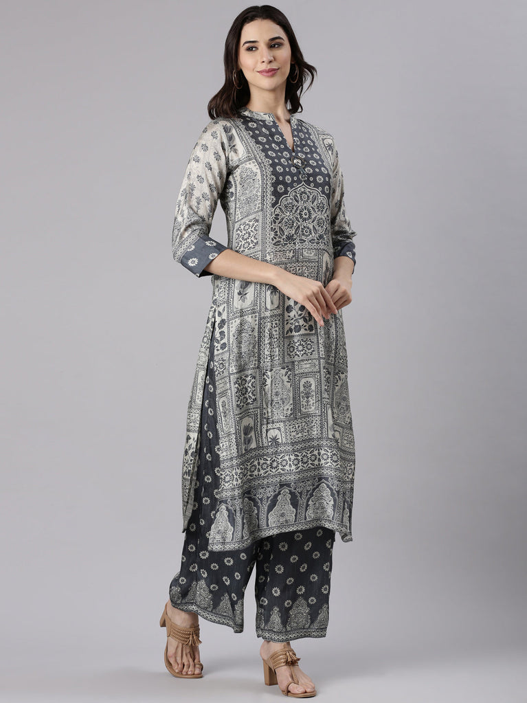 Elevate your wardrobe with this Gray Silk Ajrak Print Three Piece Set, featuring exquisite hand-blocked patterns that blend traditional artistry with modern elegance. Crafted from luxurious silk, this ensemble offers a graceful drape and a refined sheen, perfect for sophisticated occasions. The coordinated pieces deliver versatile styling options, allowing you to create a polished, timeless look effortlessly.