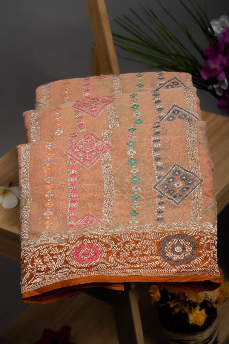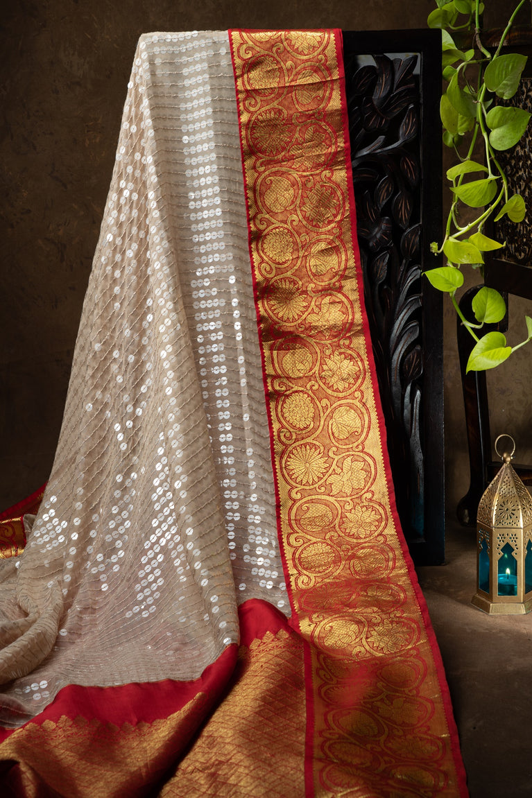 Mandir Beige & Red Kanchi Chikankari Lines Saree