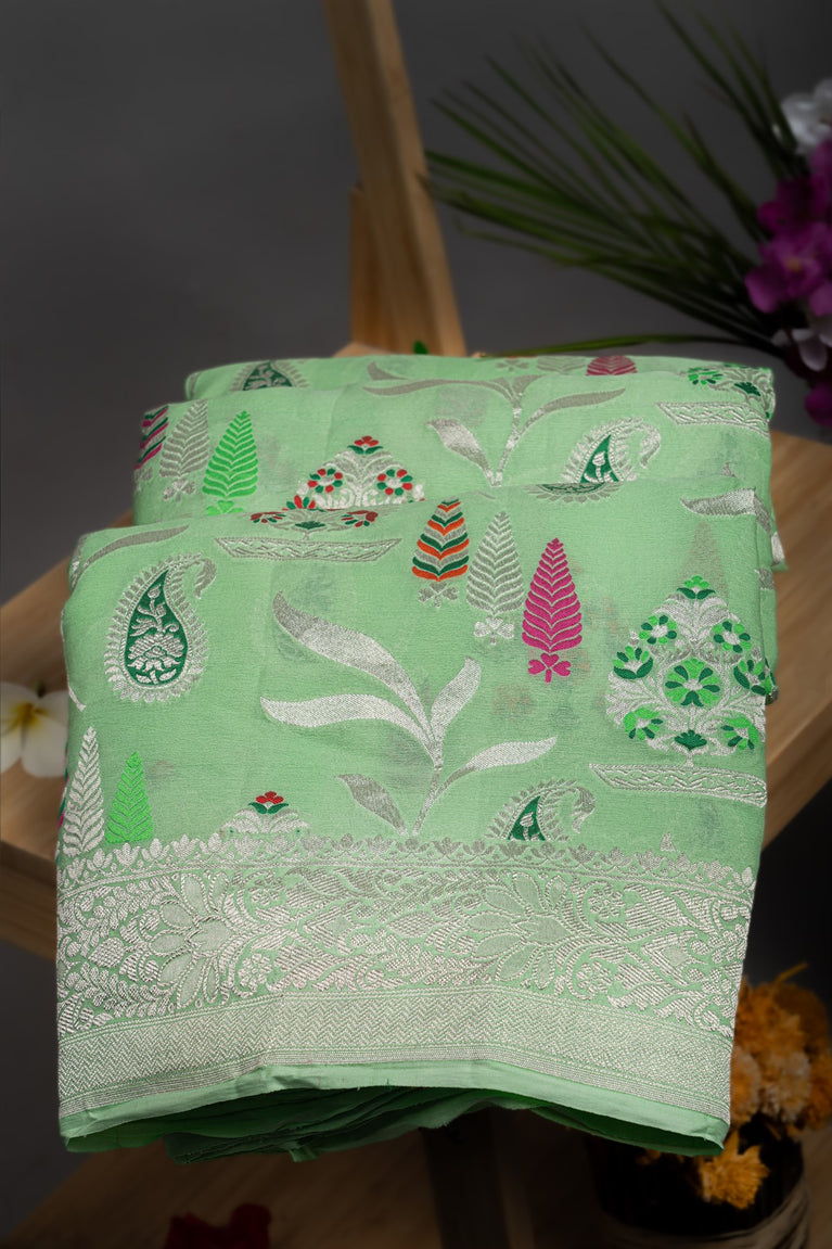 Mandir Pista Green & Silver Banarasi Floral Jaal Saree