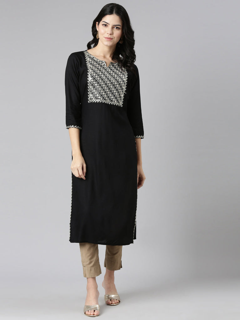 Neeru's Black Regular Straight Embroidered Kurtas