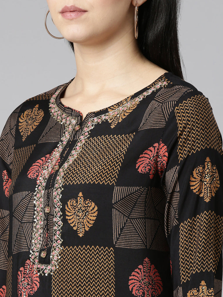 Neeru's Black Regular Straight Printed Kurtas
