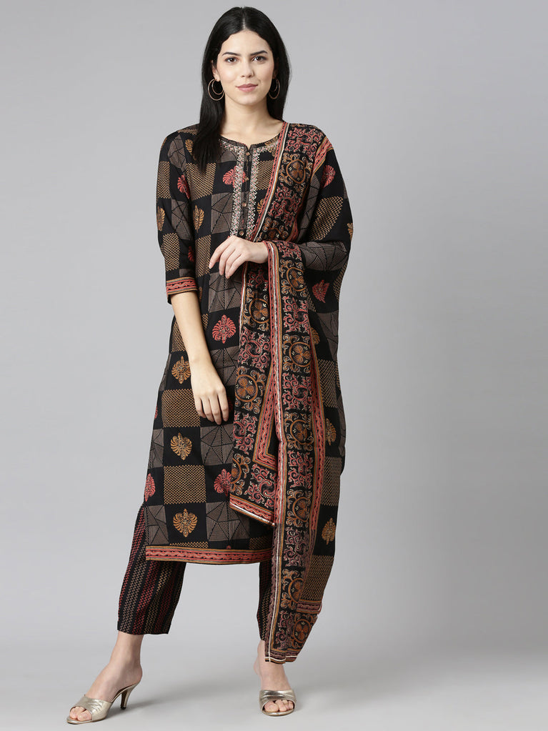 Neeru's Black Regular Straight Printed Readymade Suits