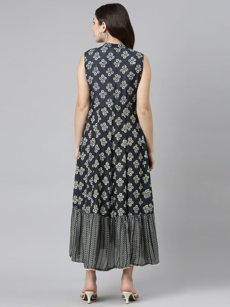 Navy Blue Muslin Printed A-Line Three Piece Set