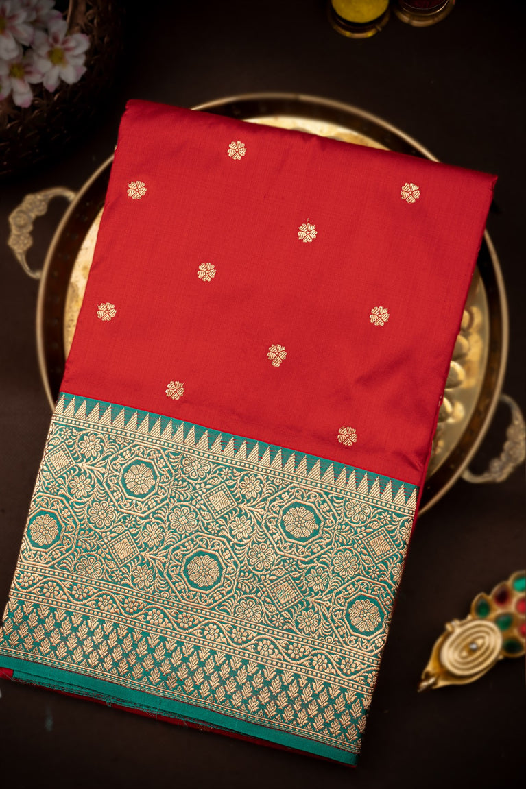 Varamahalakshmi Red & Peacock Green Banarasi Buttis Saree