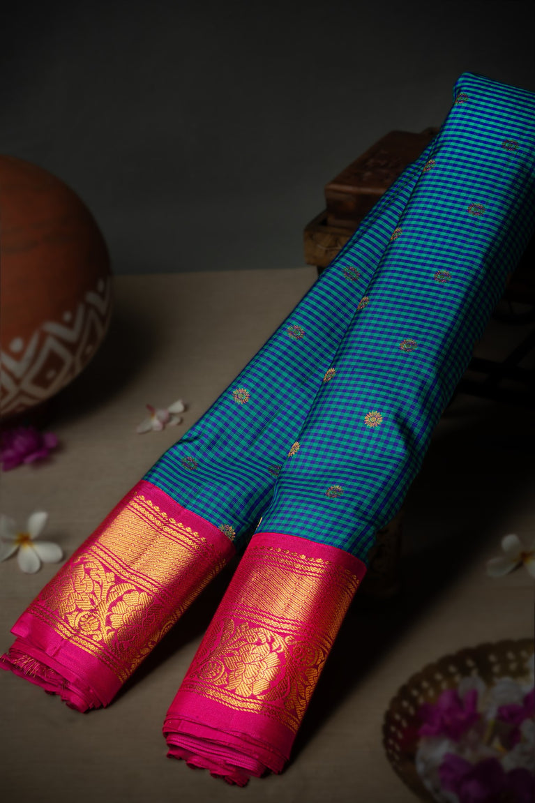 Varamahalakshmi Sea Blue & Magenta Kancheepuram Checks And Buttis Saree
