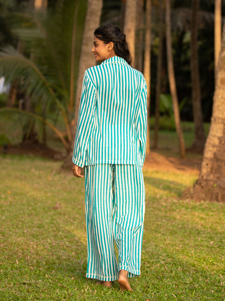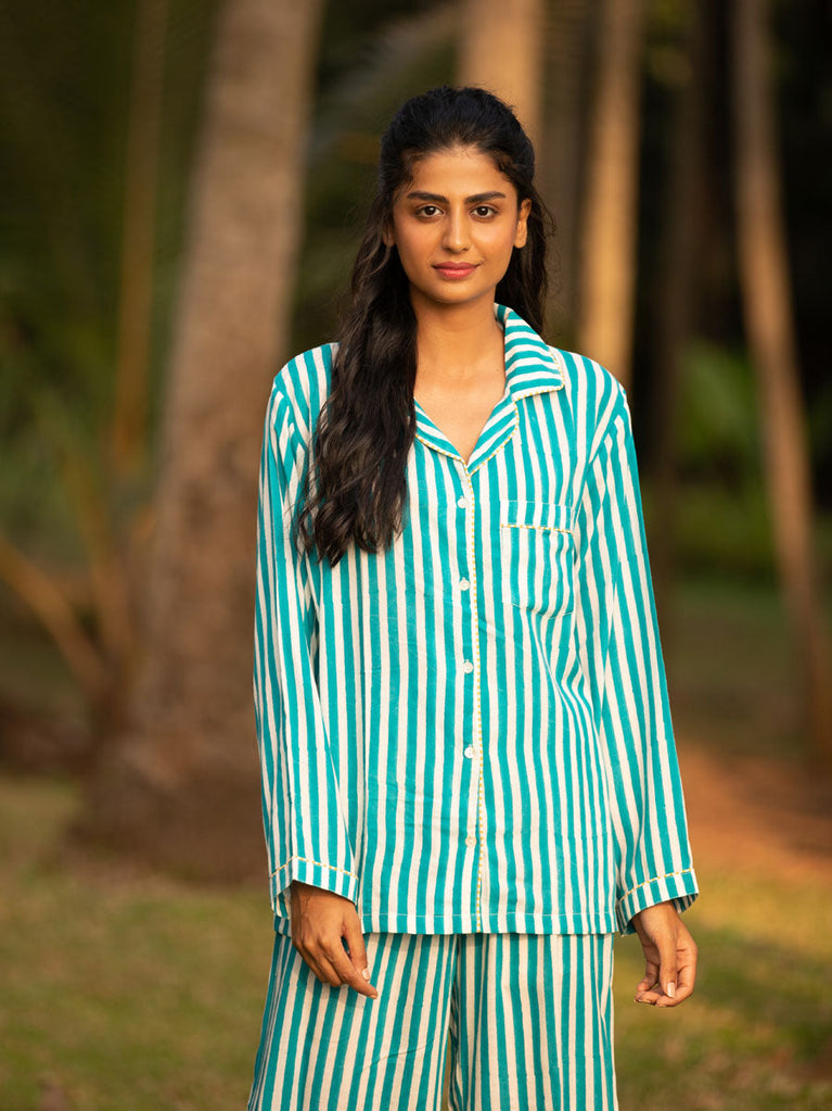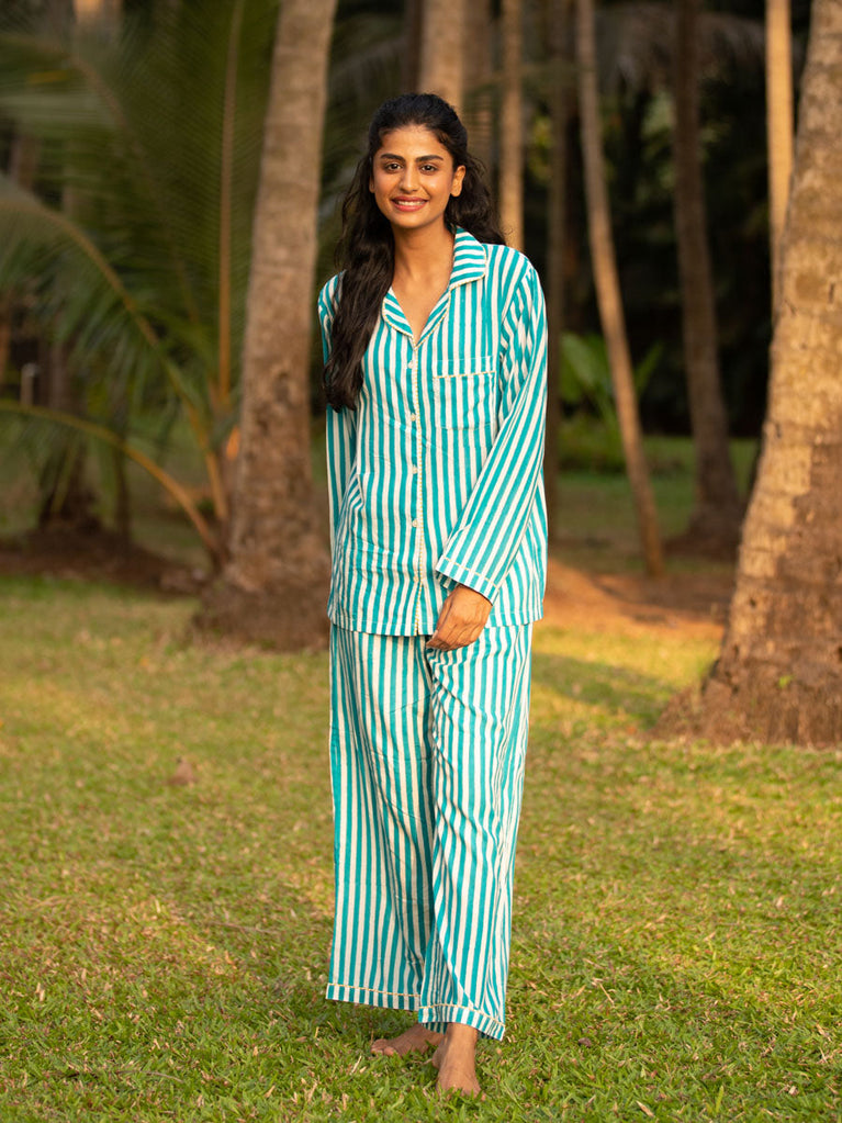 Turquoise Stripes Block Printed Cotton Top & Pyjama Set