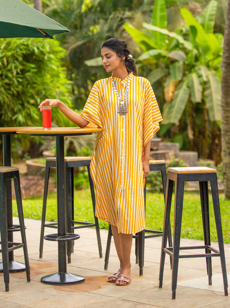 Yellow Stripes Kaftan Cotton Shirt Dress