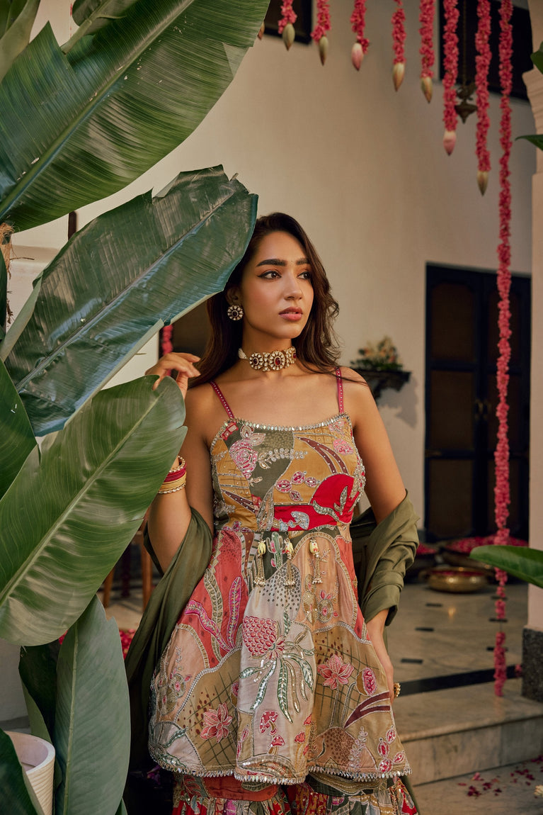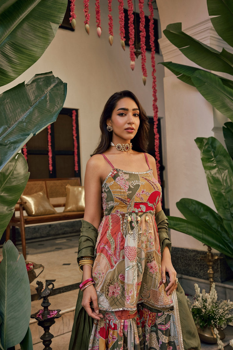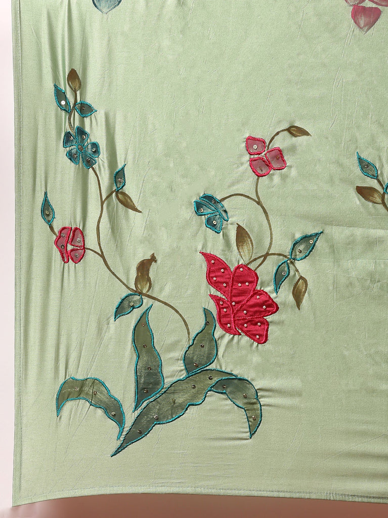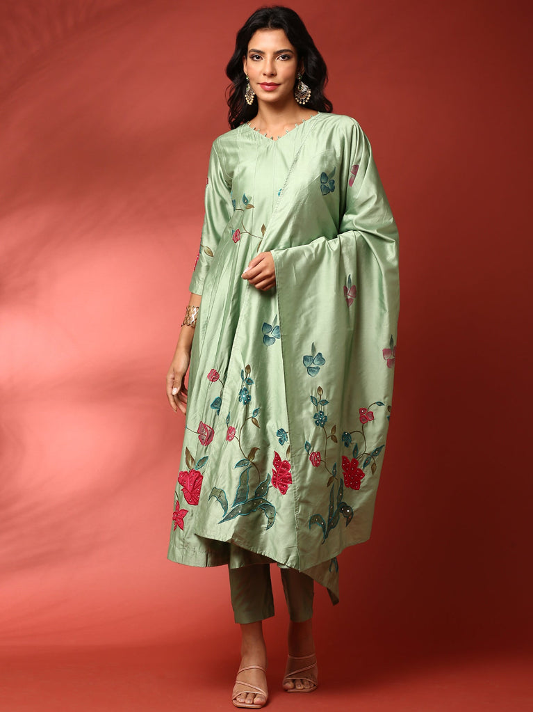 Mehadi Green Silk Zari Floral Embroidered Three Piece Set