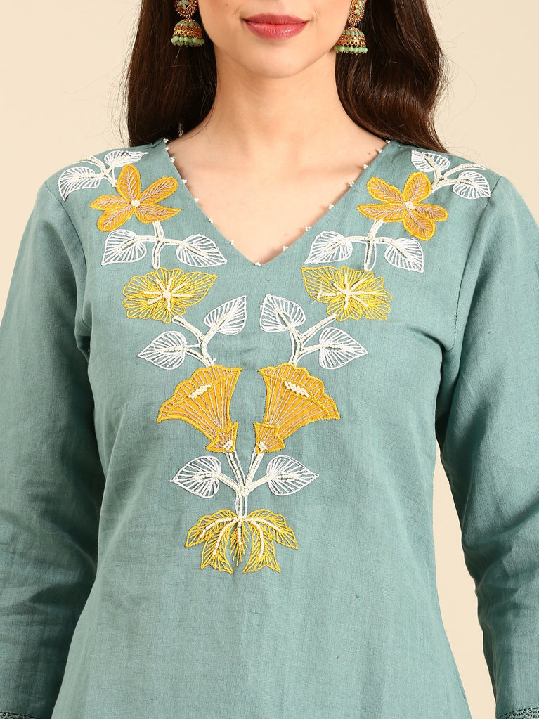 Elevate your wardrobe with this mint green linen two-piece suit set, featuring a sea green linen fabric V-neck patch intricately adorned with delicate aari embroidery. Crafted for both comfort and style, this ensemble brings a subtle yet striking elegance to your look, perfect for any occasion where grace meets tradition. The breathable linen fabric ensures you stay comfortable while the detailed embroidery adds a unique handcrafted touch, making this suit set a timeless addition to your collection.
