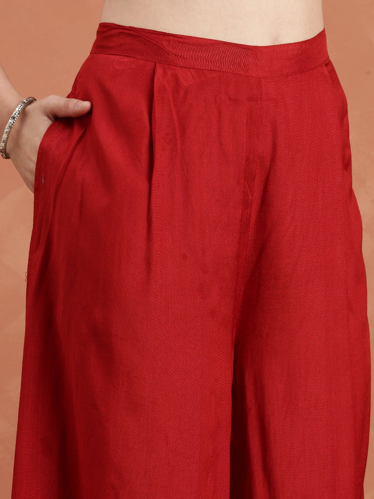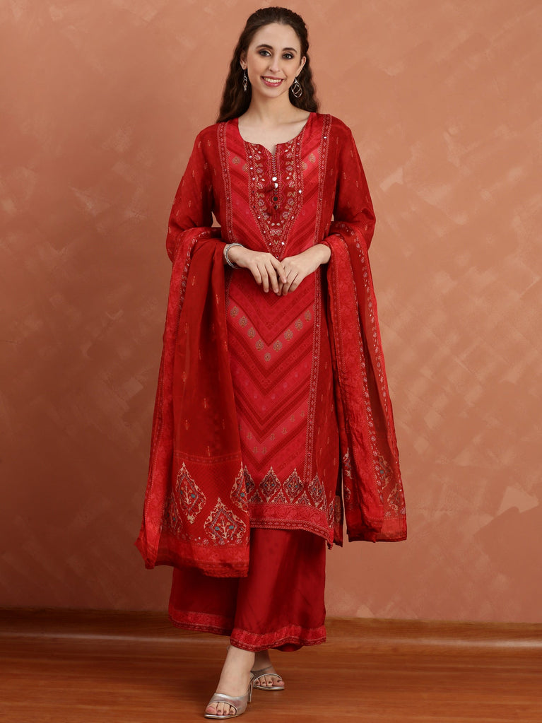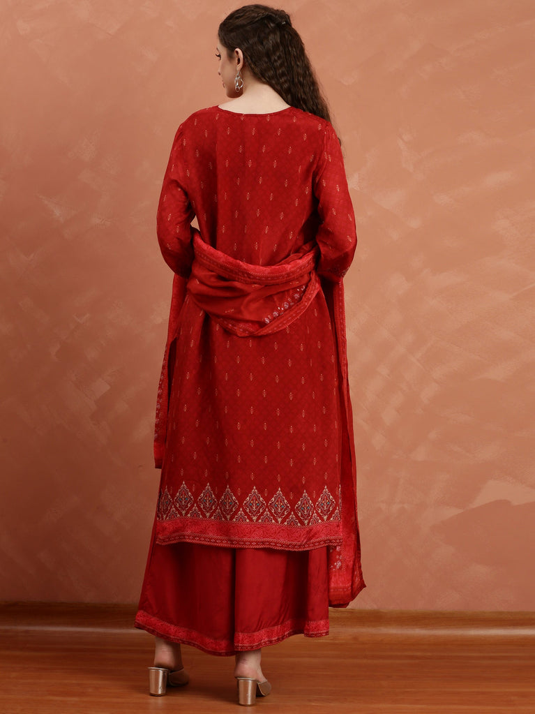 Elevate your ethnic wardrobe with this stunning Maroon Dola Silk Three Piece Set. Crafted from luxurious dola silk, this ensemble features a rich maroon hue that exudes elegance and sophistication. The three-piece collection includes coordinated pieces designed to work beautifully together, offering you versatile styling options for weddings, festivals, and special occasions.