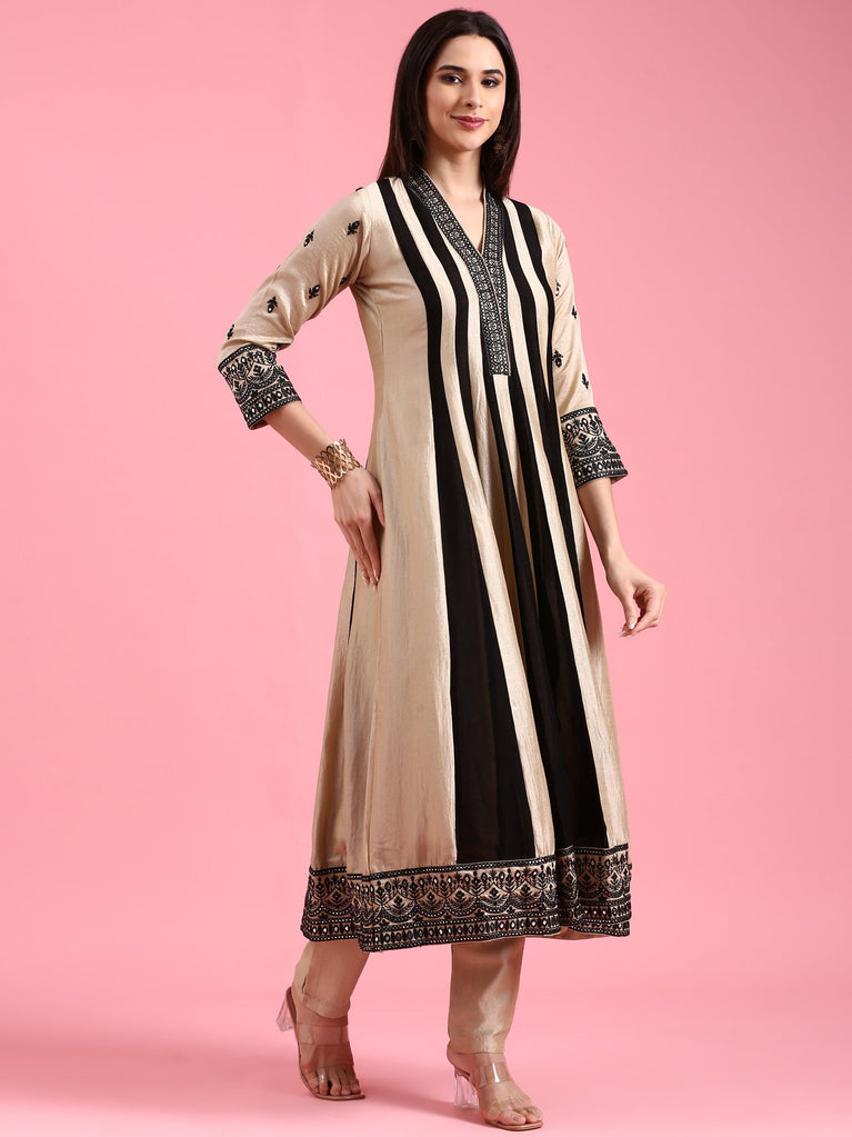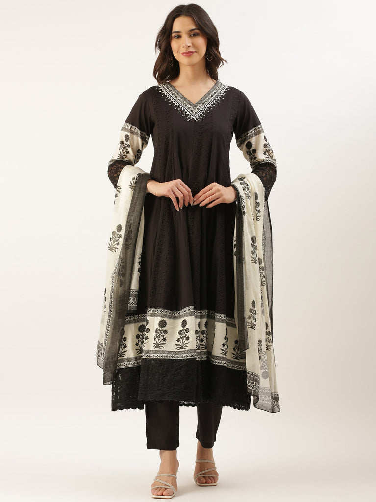 This elegant three-piece suit set features a black and cream printed design enhanced with gold zari embroidery for a subtle yet striking look. Crafted from soft black modal fabric, the anarkali suit includes a delicately embroidered neck and dhaman sleeves adorned with gold zari laces and sequins, adding a refined shimmer.