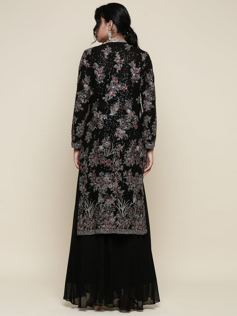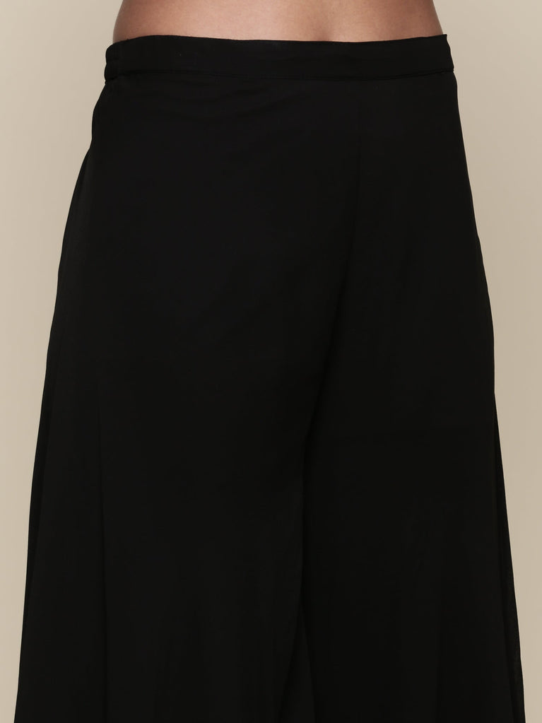 Crafted from premium black georgette, this Palazzo Set features intricate embroidery that enhances its sophisticated charm. The lightweight fabric drapes gracefully, ensuring comfort and an elegant silhouette. Ideal for formal events or festive occasions, the expertly designed set combines traditional embroidery techniques with modern tailoring for a polished, timeless look.
