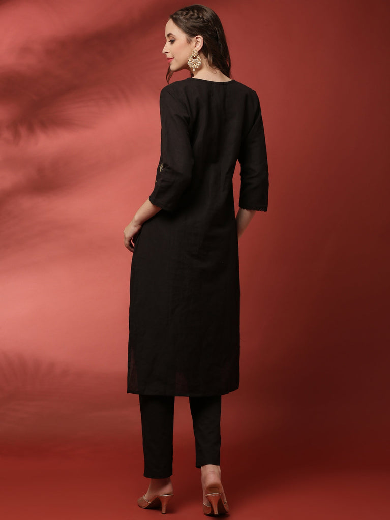 Elevate your wardrobe with this elegant black linen two-piece suit set, featuring intricate thread embroidery enhanced by subtle sequin accents. Perfect for both formal and festive occasions, it combines timeless craftsmanship with a modern touch, ensuring you stand out with understated sophistication and comfort.