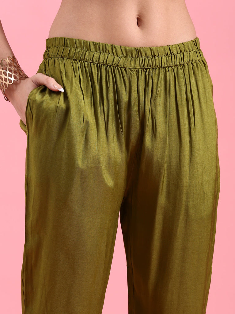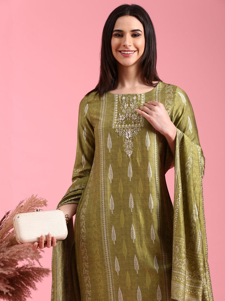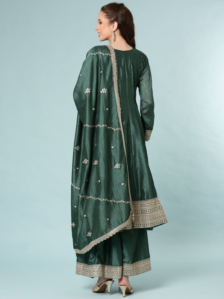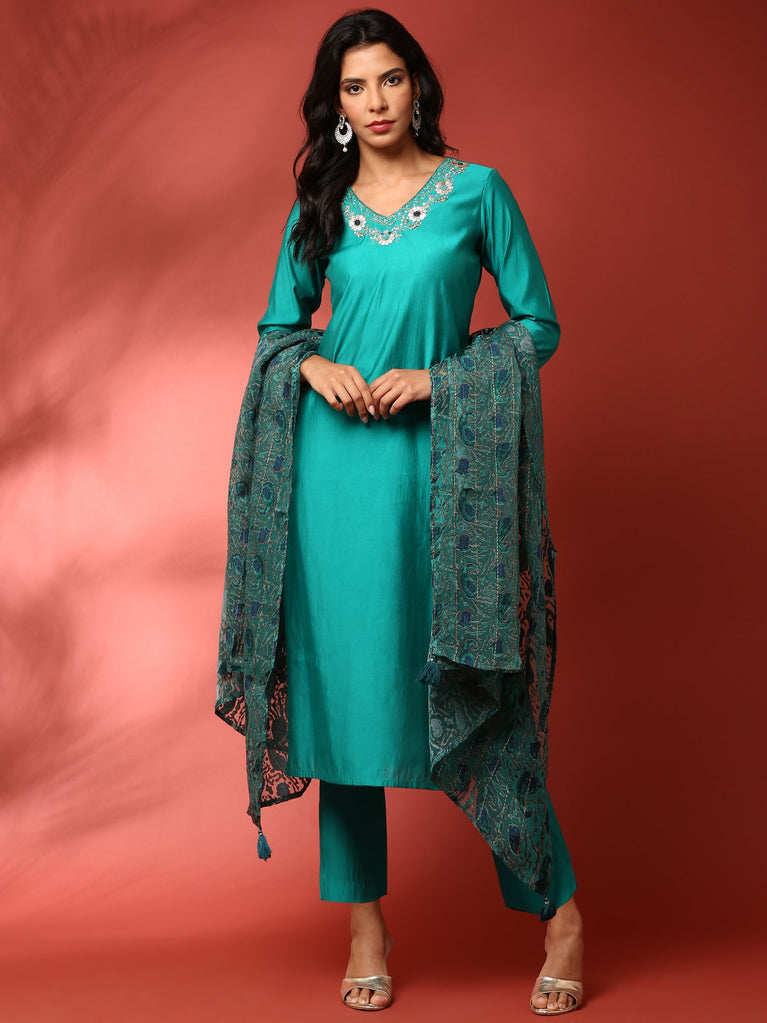 Elevate your style with this elegant green dola silk embroidered three-piece suit set. Featuring rich embroidery on lustrous fabric, it brings a perfect blend of tradition and sophistication. Comfortable and lightweight, this set ensures ease of wear for any occasion while making a striking impression. Ideal for festive celebrations or formal events, it adds a touch of timeless charm to your wardrobe.