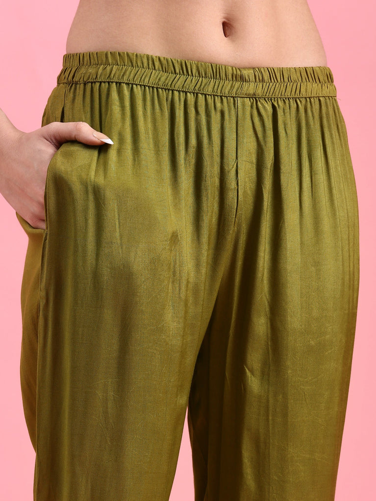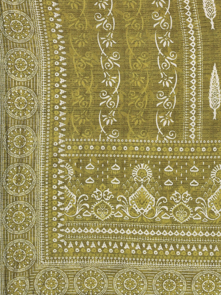 This green rayon printed three-piece set combines comfort and style effortlessly. Crafted from soft rayon fabric, it ensures breathable wear throughout the day. The vibrant printed design adds a fresh, elegant touch, perfect for casual outings or relaxed gatherings. Each piece complements the others for a coordinated look that’s easy to wear and maintain. Ideal for those seeking a versatile and comfortable outfit with subtle charm.