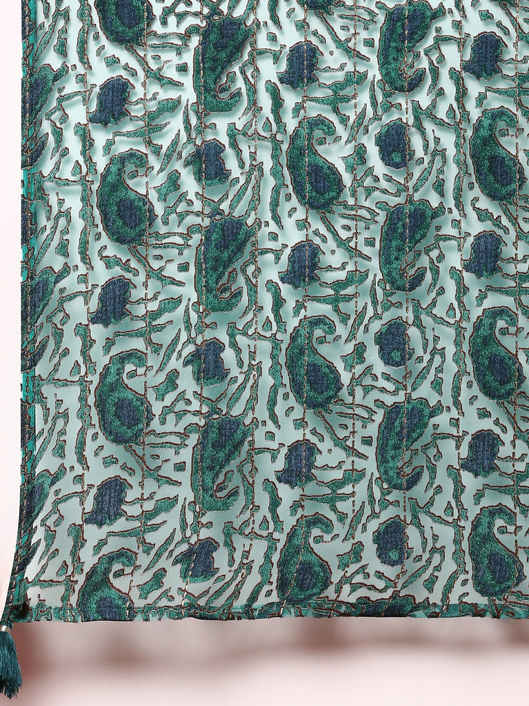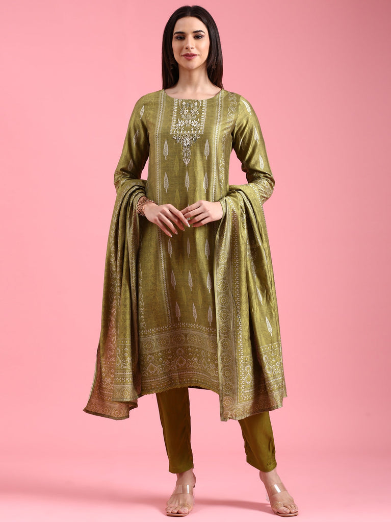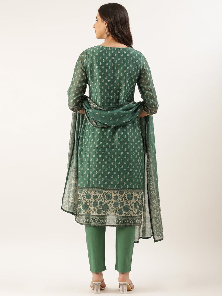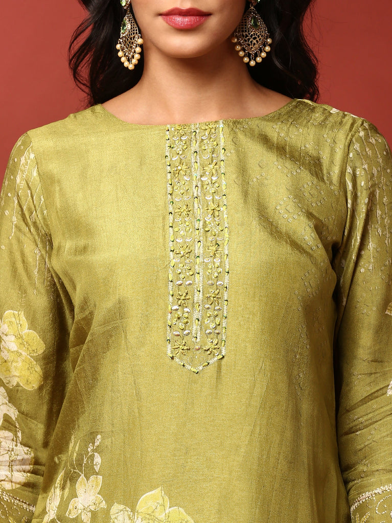 Green Tissue Printed Embroidery Three Piece Suit Set
