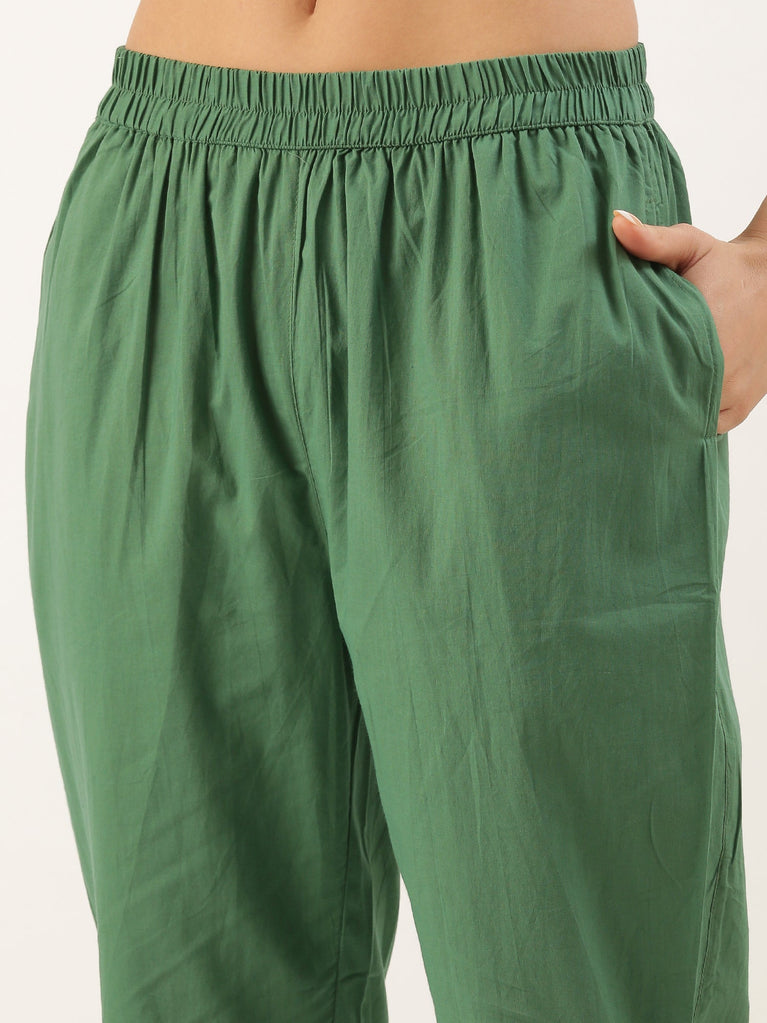 Elevate your ethnic wardrobe with this elegant green muslin three-piece suit set, adorned with delicate embroidery that adds a touch of sophistication. The breathable muslin fabric ensures comfort throughout the day, while the coordinating pieces offer versatile styling options for any occasion. Perfect for festive gatherings or casual outings, this suit set combines tradition with effortless grace.