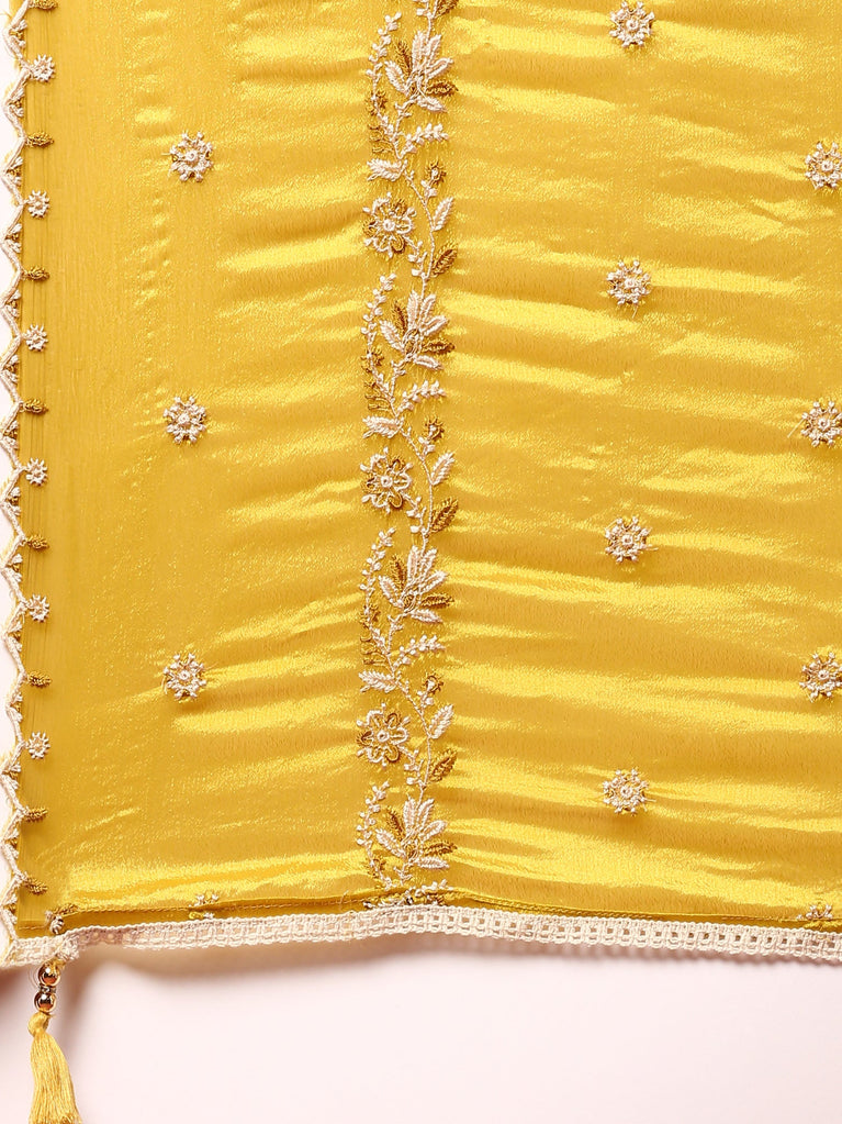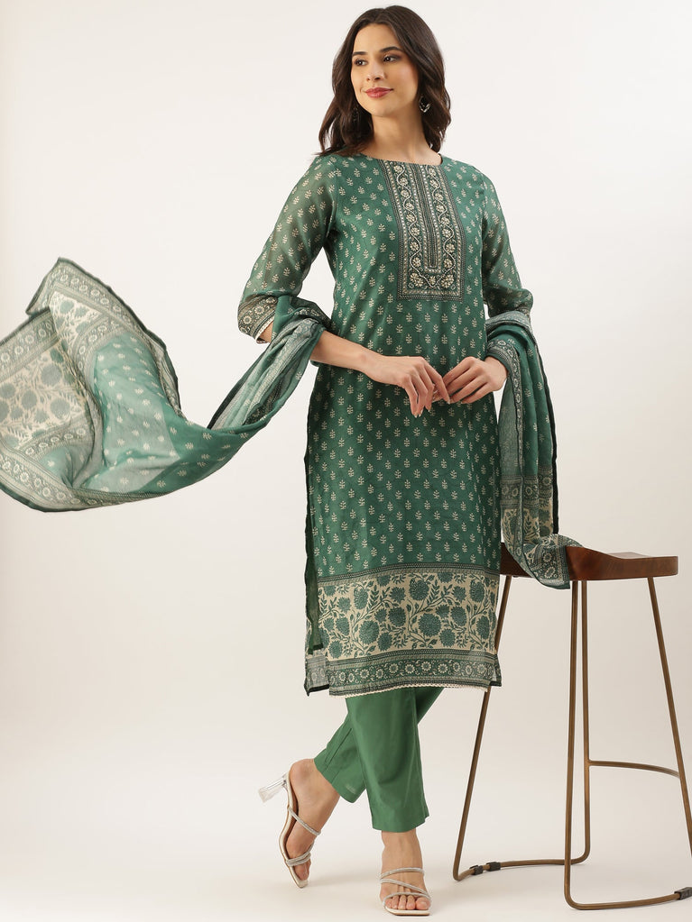 Elevate your traditional wardrobe with this green organza three-piece set featuring delicate printed patterns and intricate embroidery. Lightweight and breathable, this ensemble combines elegance and comfort, perfect for festive occasions or special gatherings. The coordinated pieces offer versatility while ensuring you stand out with subtle sophistication.
