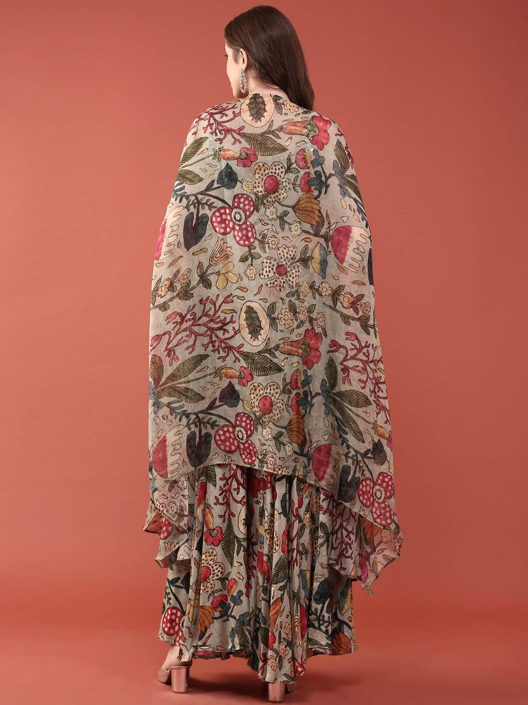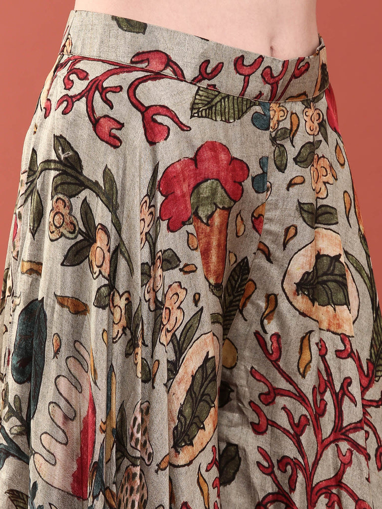 Experience timeless elegance with this Grey Kalamkari Silk A-line three-piece suit set. Crafted from premium silk, it features intricate Kalamkari patterns that blend traditional artistry with contemporary design. The A-line silhouette ensures a flattering fit, while the three-piece ensemble offers versatility for various occasions. Perfect for formal events or festive celebrations, this suit combines comfort with sophistication, making it a refined addition to your wardrobe.