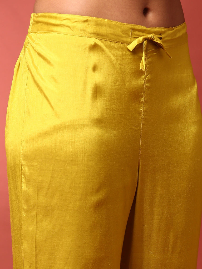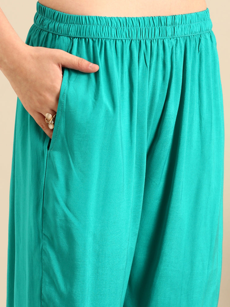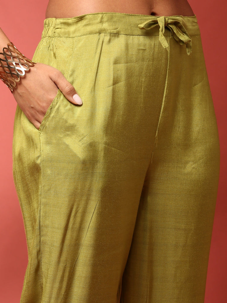 Elevate your ethnic wardrobe with this stunning green silk ensemble that beautifully combines traditional craftsmanship with contemporary style. The crop top features intricate sequin embroidery that catches light with every movement, creating an eye-catching shimmer perfect for celebrations and special occasions. Paired with flowing palazzo pants, this set offers the ideal balance of elegance and comfort.