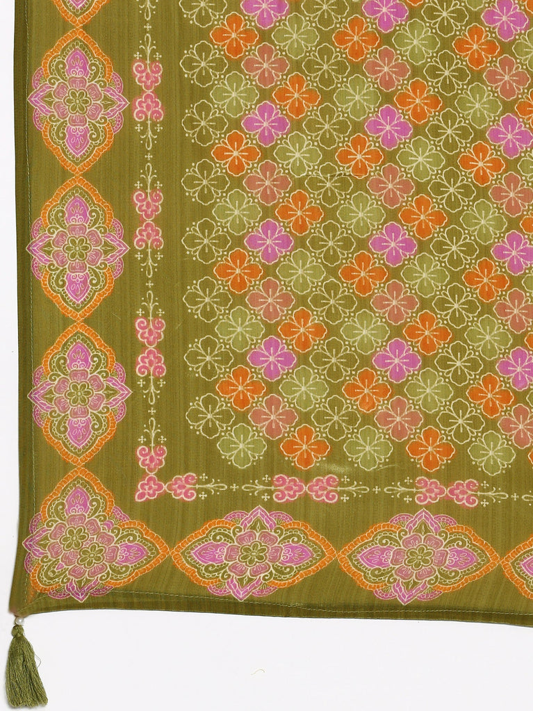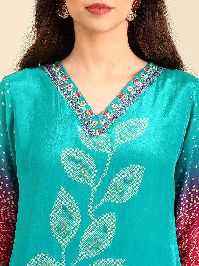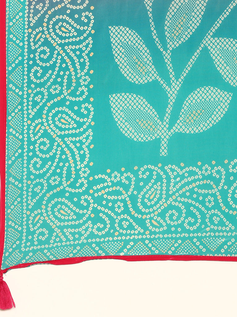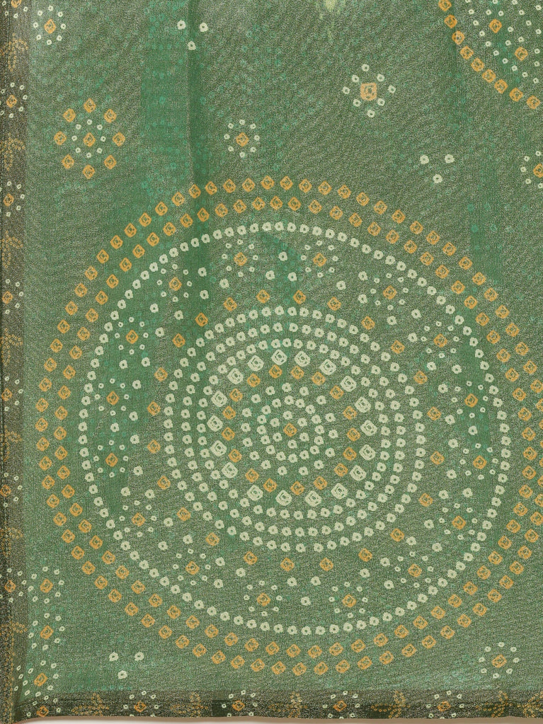 Elevate your ethnic wardrobe with this green two-colored crepe three-piece suit set featuring an elegant bandhani print. The V-neck and sleeves are adorned with delicate embroidery and shimmering mirror work, adding a subtle sparkle to your look. Crafted from soft crepe fabric, this set blends comfort with style, perfect for festive occasions or casual gatherings.