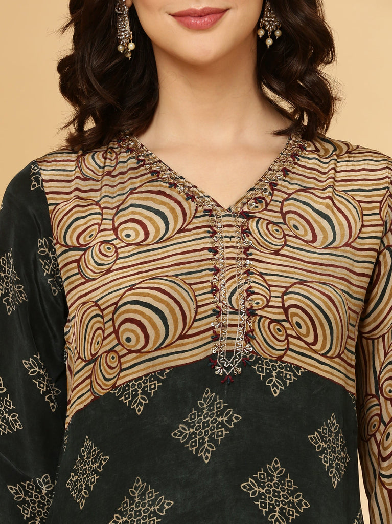 Elevate your wardrobe with this elegant green floral printed three-piece jacket set, exquisitely hand embroidered to showcase intricate craftsmanship. Perfect for special occasions or festive events, the lightweight jacket adds a refined touch while providing comfortable wear. This coordinated set offers versatile styling options that blend traditional charm with contemporary flair, ensuring you stand out with grace and sophistication.