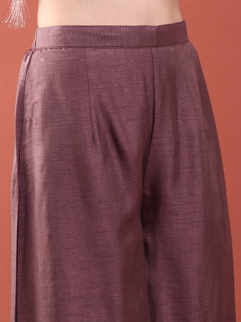 Elevate your ethnic wardrobe with this exquisite Lilac Chinnon three-piece ensemble. Crafted from premium chinnon fabric, known for its lightweight breathability and elegant drape, this set combines traditional sophistication with contemporary styling. The soft lilac hue offers versatility for both festive occasions and everyday wear.