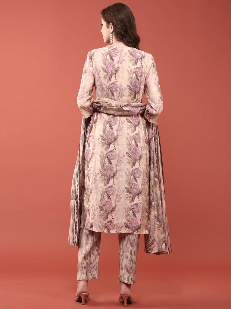 Elevate your ethnic wardrobe with this exquisite three-piece ensemble crafted from premium modal silk. The lavender base provides a sophisticated canvas for intricate floral digital prints that showcase contemporary design sensibilities. This versatile set combines comfort with elegance, making it ideal for festive occasions, celebrations, or refined everyday wear.