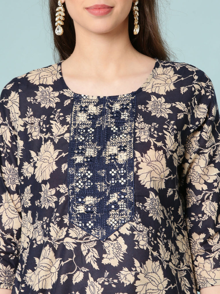 Indigo Cotton Printed Anarkali Three Piece Set
