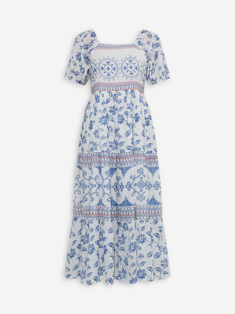 Bombay Paisley White Floral Patterned Cotton Tiered Dress