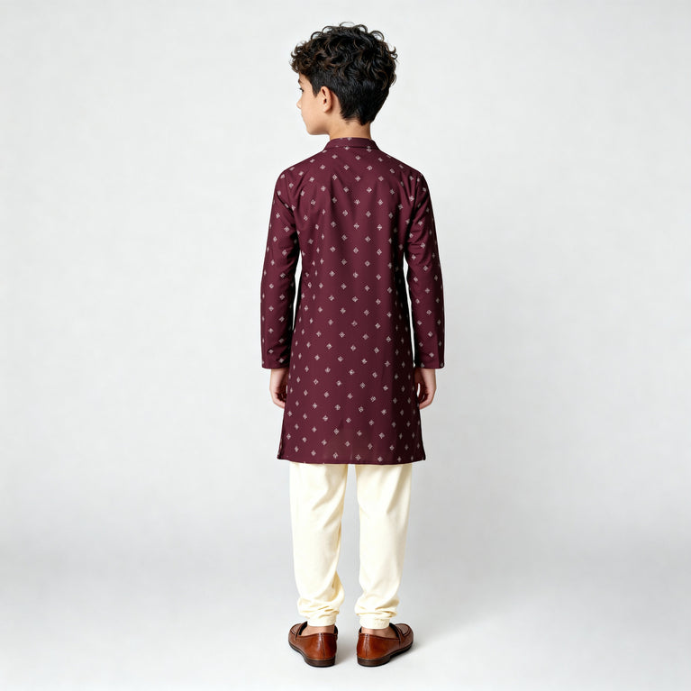 Elevate your young one's wardrobe with our Boys Printed Kurta with Pant Set, crafted from a soft and breathable viscose polyester blend. This stylish ensemble features a vibrant printed design, perfect for festive occasions or family gatherings.