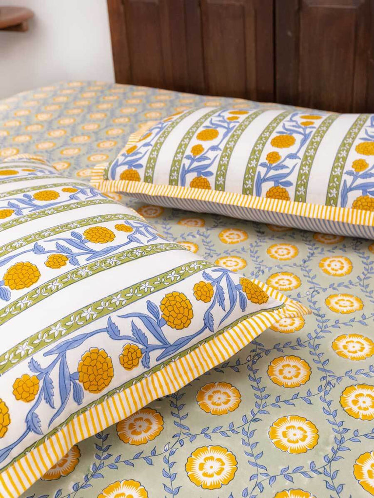 Golden Bloom Hand Block Printed Cotton Bed Sheet