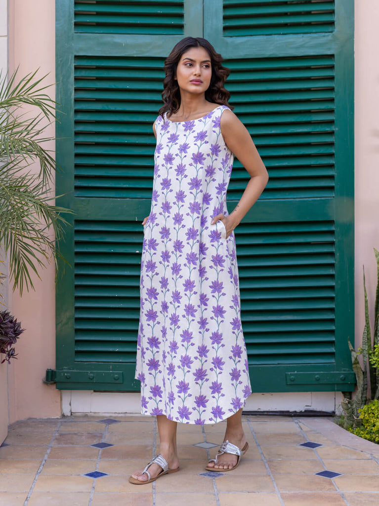 Kavya Block Printed Sleeveless Cotton Dress/Kurta