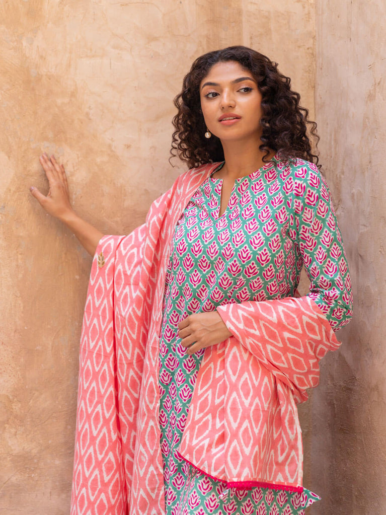 Pink Ikat Organic Cotton Block Printed Long Kurta