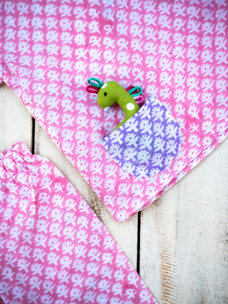 Pink Giraffe Block Printed Cotton Top & Pyjama Set