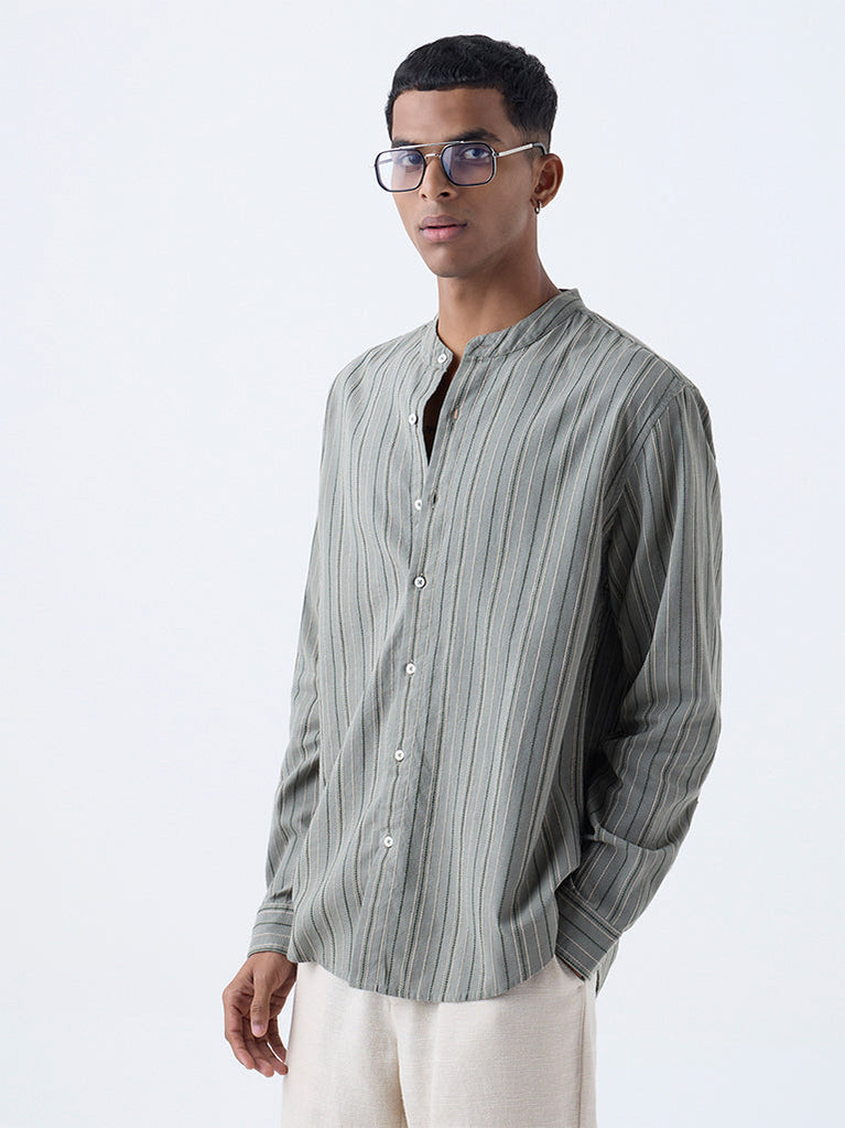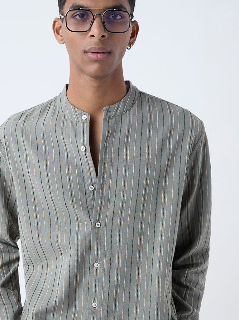 This sage striped shirt from ETA brings a fresh take to everyday dressing. Crafted from pure cotton, it features a resort fit with white vertical stripes, a band collar, full sleeves, and a button-down front — perfect for an easy, laid-back look.
