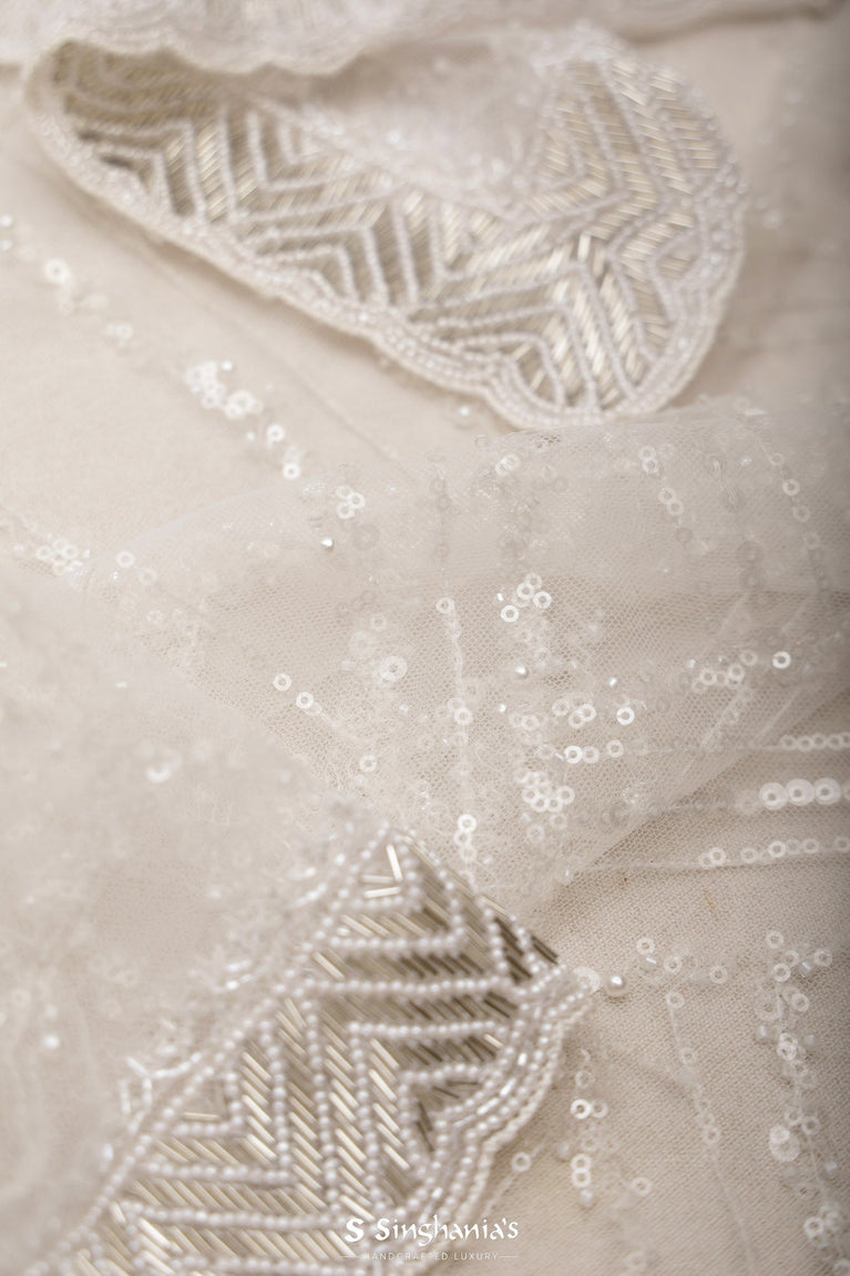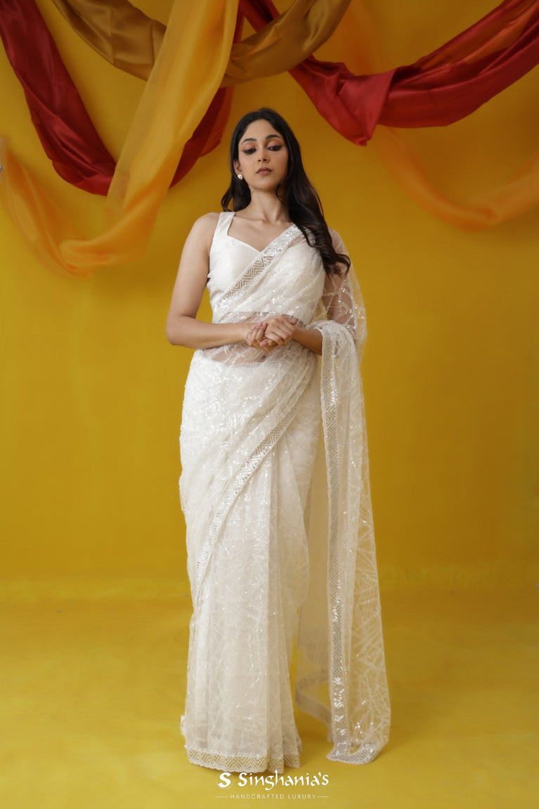 Exquisite Half White Net Sare featuring jaal embroidery in sequins and bead work. Ideal for weddings. Adorned with a small border, designed with embroidered geometrical pattern. The saree epitomizes the grandeur of handwork.