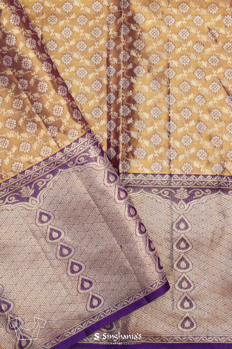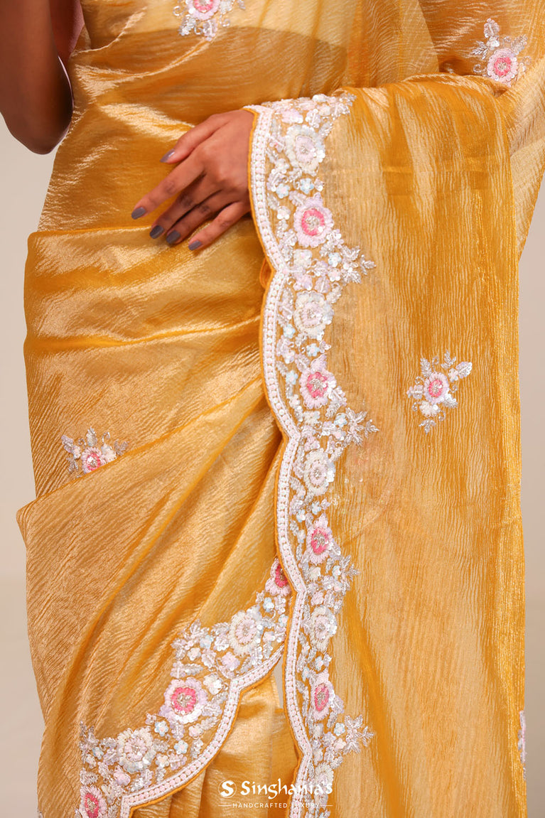 A luminous harvest gold saree with a tissue base, which features all over floral butti embroidery. Added with floral embroidered border and pallu, crafted with beads, sequins and glass beads. Suitable for festive wear, and wedding parties.